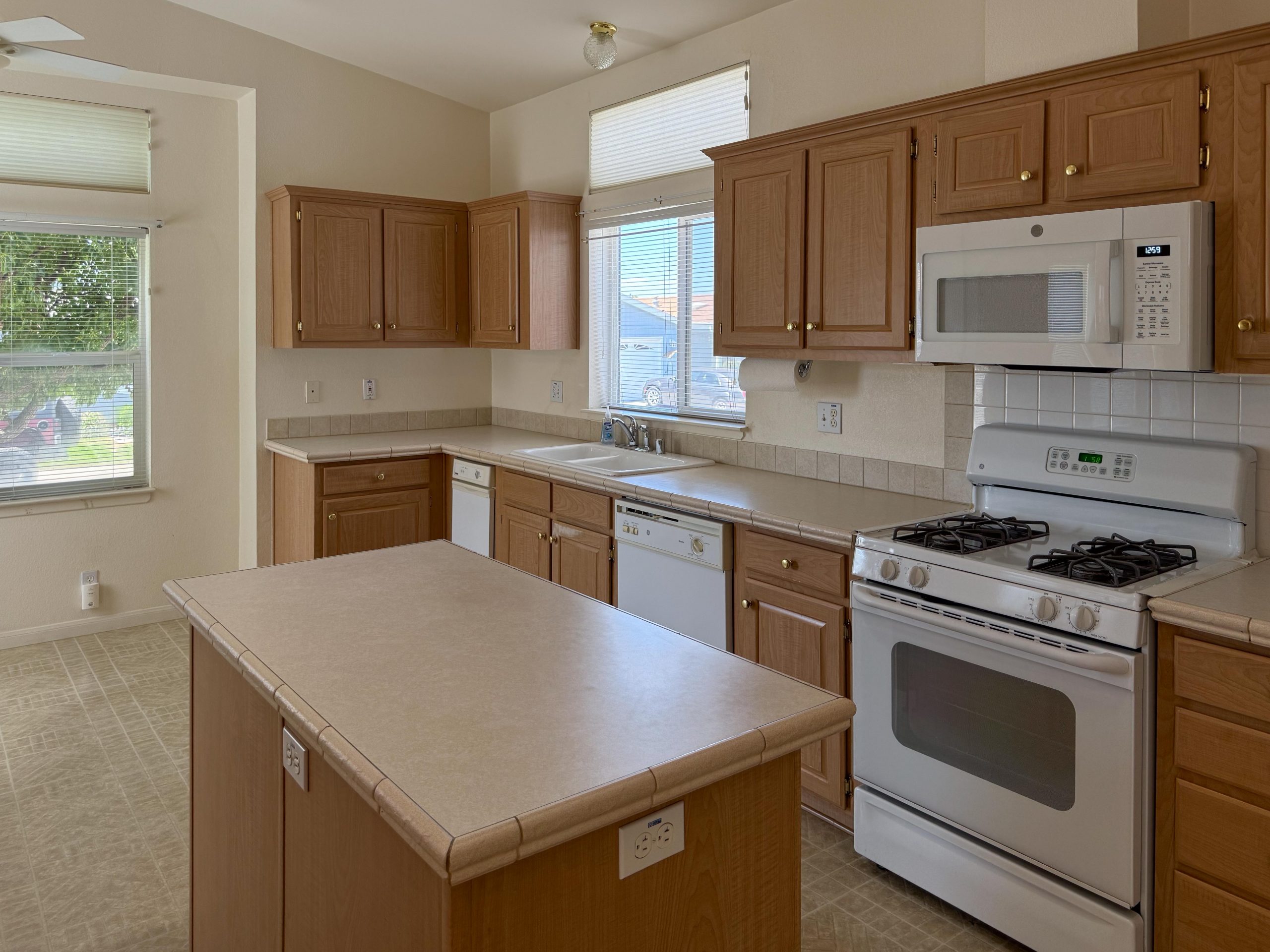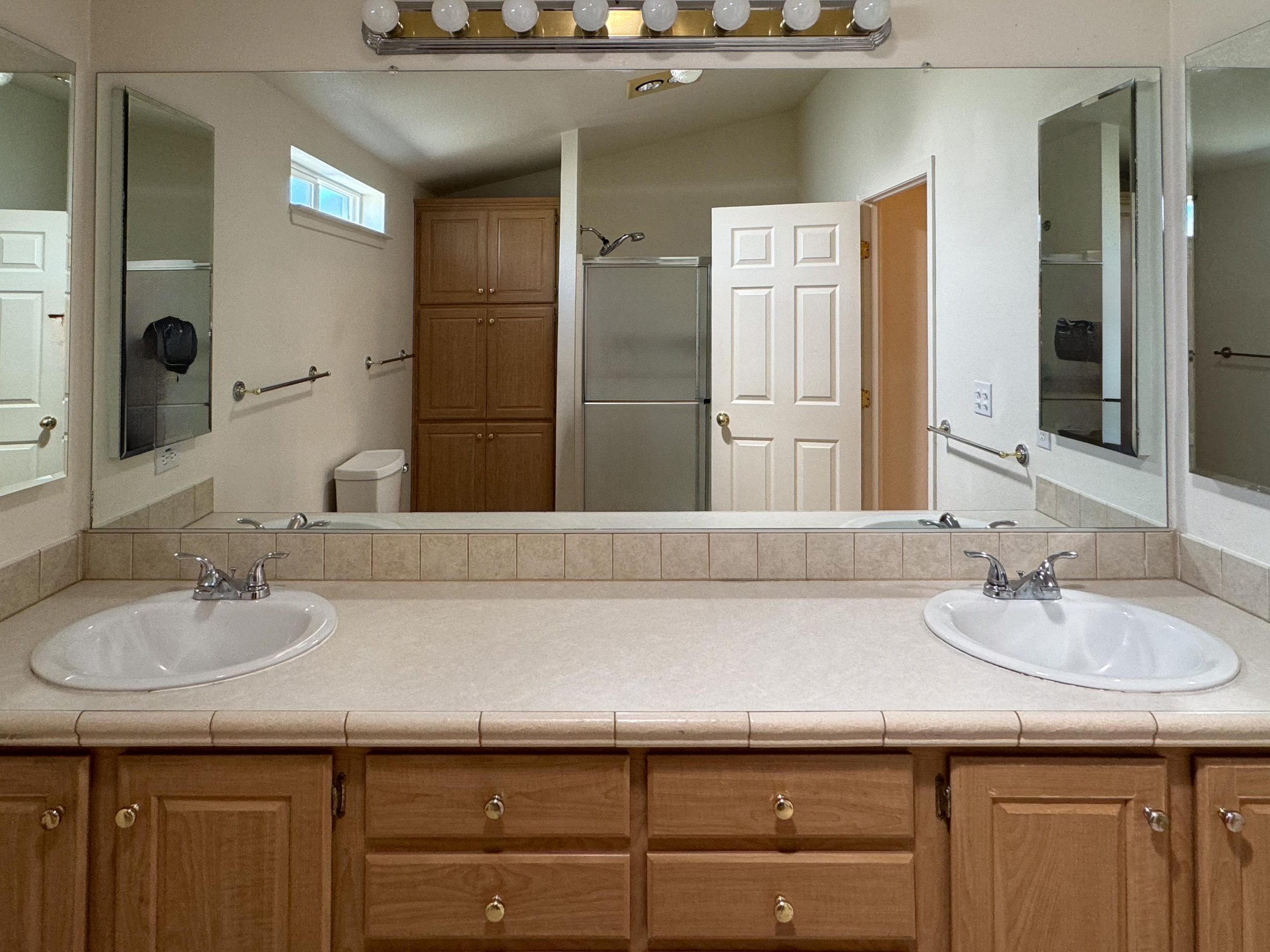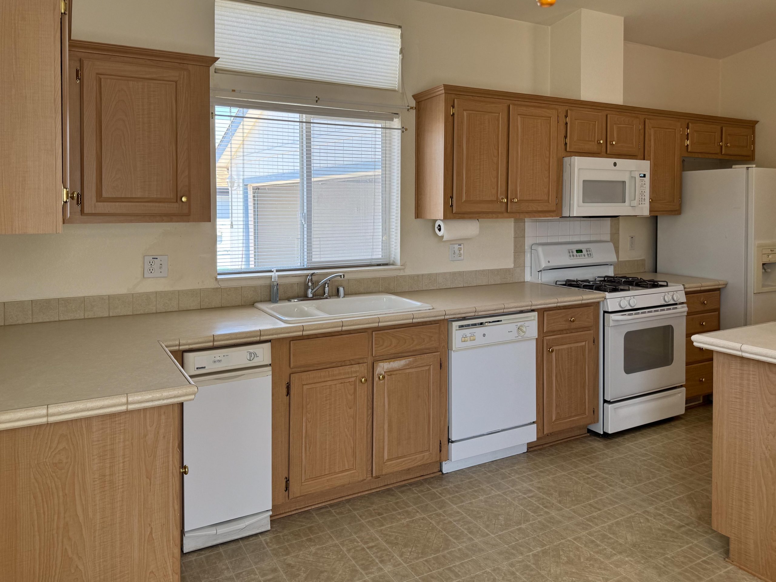 3 Bedrooms!!! One of the few and so well taken care of in our beautiful 55+ community. High ceilings, laminate flooring, new Linoleum in the bathrooms, private entrance/exit in one of the guest bedrooms perfect for company or maybe a care giver that leads right out to the covered patio. Take a look at the kitchen, armed with a trash compactor, new microwave, upgraded sink, abundance of cabinet space with pull outs and 2 pantry’s, 1 in the kitchen and 1 in the UT room. The UT room does have a sink with additional cabinets above the washer and dryer that leads directly out to the 2-car garage. The primary bath has double sinks with a 60” shower and its own linen closet, the primary bedroom has double closets and can accommodate a king size bed. Other than the bathrooms and UT room there are ceiling fans in each room. Spacious rooms, lots of natural lighting, solar tubes, new 4 ton A/C condenser with a 10-year warranty, great back yard with a covered patio, storage shed and an automatic sprinkler system. This home is loaded with convenience and well thought out.